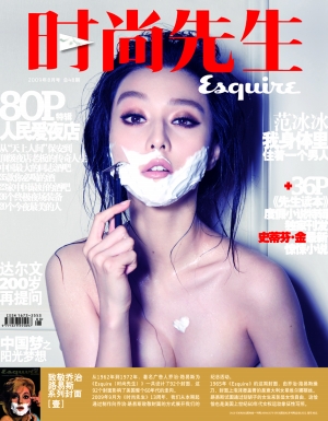 ,于近日登上《时尚先生》8月刊封面,成为该男性刊物2009年内唯一的女性人物封面。在这张封面大片上,范冰冰以突破性的“刮胡子”造型出镜,泡沫覆盖着半张脸,产生出一种超乎寻常的神秘感,手中的剃须刀在脸上定格,塑造出一个帅气、自我、同时又颠覆以往所有男性幻想中的女性形象。