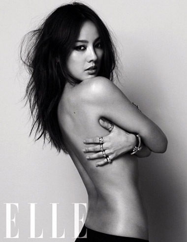 韩国女星李孝利最近为时尚杂志《ELLE》拍摄了一组画报,脱去上衣用手罩住前胸的造型惊艳四座,