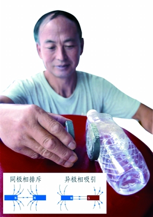 “这个原理其实很简单,就是磁铁‘同性相斥’。”黄纯开边说边开始了实验,他手里拿着剩下的一块磁铁,慢慢靠近矿泉水瓶,矿泉水瓶自己动了起来。