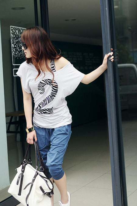 豹纹控层搭露肩短袖T,搭配蓝色运动款中裤,打造街头性感运动风。