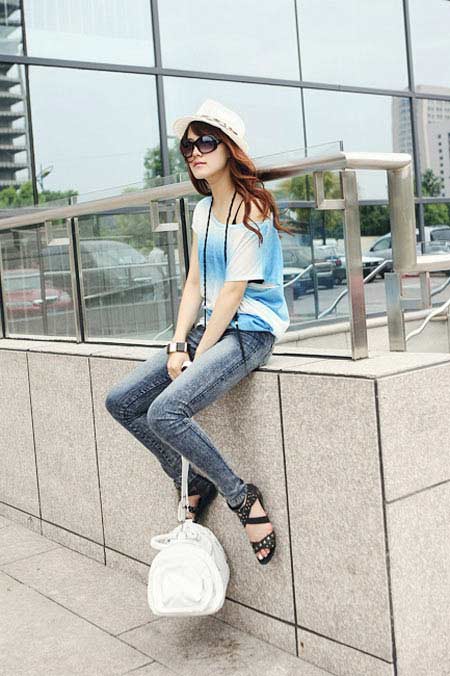 白色T搭配蓝色短裤,超级清爽的色彩搭配,像夏日里的清风哦。
