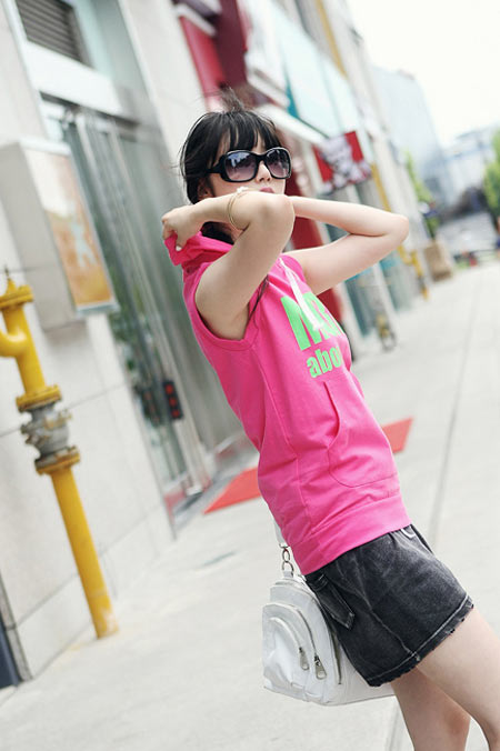 粉色连帽衫搭配超短仔裙,清爽不甜腻的粉色薄荷糖。