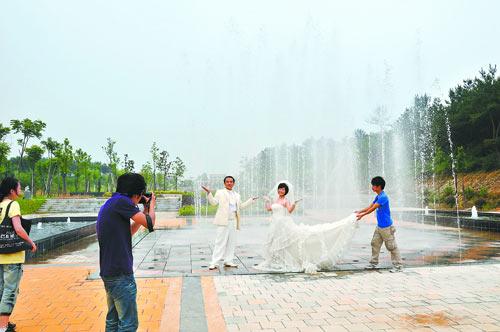 本报讯(记者彭仲)对许多人而言,墓地是忌讳之地,但昨日的黄陂长乐园陵园却迎来了两对“80后”新人,他们以陵园里的绿阴湖畔、喷泉长廊为背景,定格一个个甜蜜的瞬间(如下图)。