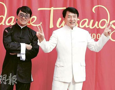 当天成龙身着白色衫,与蜡像版成龙的黑色形成鲜明的对比。对于蜡像,成龙感到非常满意,亲切地摆出各种姿势与其合照。