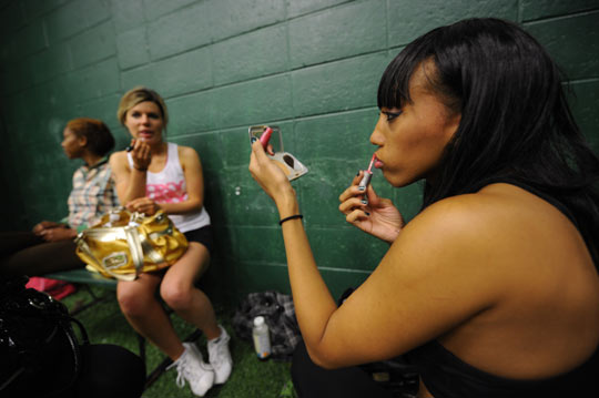 面对激烈的竞争,诸位辣妹也不忘注意自己的仪表。在场边,美女们纷纷补妆,保持自己在比赛场上靓丽的形象。
