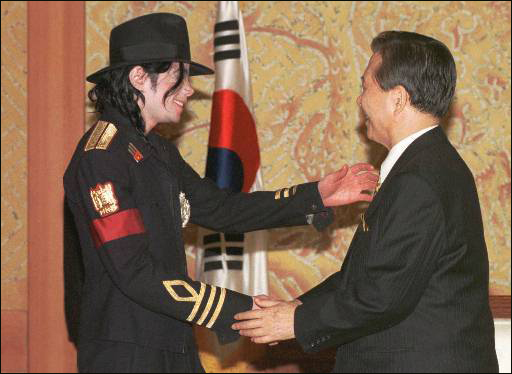 韩国前总统金大中与迈克尔杰克逊在一起。1998年2月,迈克尔参加了韩国金大中总统的就职仪式。