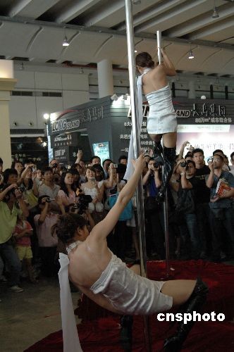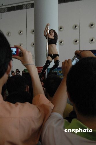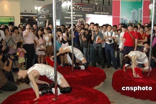 5月1日,广西南宁国际会展中心内的钢管舞表演吸引众人眼球。当日,2009广西(南宁)房地产博览会在南宁国际会展中心举行。