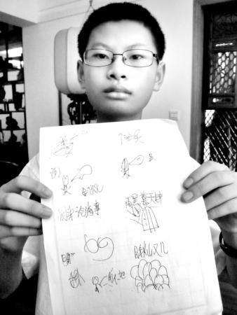 记者随便从一本书上找到一首生僻古诗 《喜见外弟又言别》,只见吴宇祺一边画着别人看不懂的图案,一边默记。3分钟后,记者将书和他画的怪图收起,这个小男孩竟能一字不差地背下古诗。“我这图称作‘记忆思维导图’,只有我自己能看得懂,它帮助我强化记忆。”吴宇祺说。