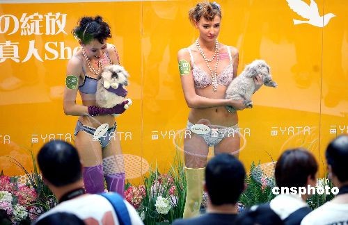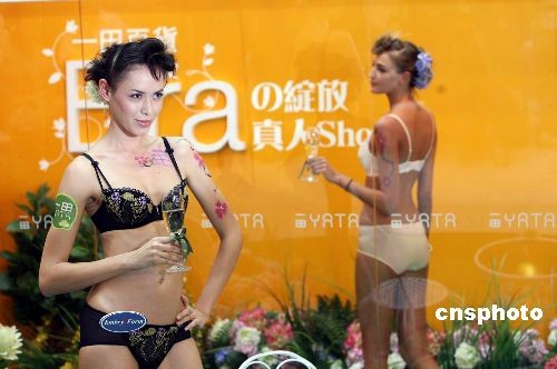 日资一田百货在商场举办玻璃橱窗真人内衣秀,由性感模特演绎多个品牌的春夏内衣。中新社发 洪少葵 摄