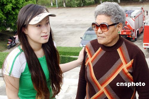 世界上第一个登上珠穆朗玛峰的藏族女英雄潘多和广西登山第一美女罗丽莉。 中新社发 骆文刚 摄