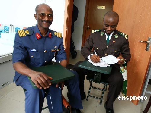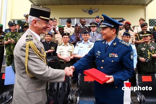 图为中国空军刘明豹(右)大校与驻华武官团团长谢贝德上校互赠礼物。