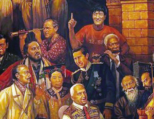 这幅画可谓让网友们开了眼,从来没见过谁把如此众多中外知名人物画在一幅画面中的,更何况还把这些名人们拼接得如此妙趣横生、天衣无缝,大有天下大同之感。恐怖分子拉登就站在布什身后,成吉思汗和拿破仑并驾齐驱,摇滚明星崔健站在慷慨激昂的列宁身后,而他旁边就是手拿书卷的希腊行吟诗人荷马,而亚里士多德的手正扶在比尔盖茨的肩上,比尔盖茨身前是球王贝利,就在他的旁边,手拿大刀的关云长和希特勒一起在聆听贝多芬的琴声,不远处雷锋叔叔带着他熟悉的笑容望向画面之外,而在画面中央的圆桌旁,斯大林和达芬奇则比邻而坐,毛泽东和林肯促膝而谈……简直就是一幅世界名人的全家福。