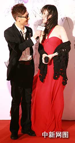 女星周慧敏,今日在国家游泳中心水立方以一袭鲜红的低胸纱裙配黑色披肩,亮相第二届