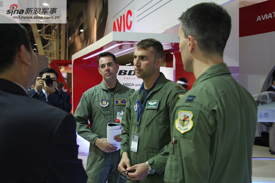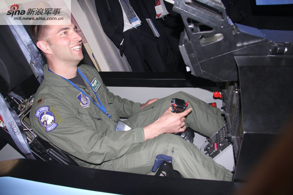 三名美军飞行员有两名试飞了猎鹰模拟训练系统,杨大校在旁边观看了全程。在中航工作人员的指导下美军飞行员上手很快,短短的几分钟内就完成了整个飞行,据工作人员介绍模拟器显示的地形是美国的盐湖城地区,美军飞行员知道这一信息后将飞机飞到一座“城市上空 ”说:“我女朋友住在这附近”引得周围人群一通大笑。