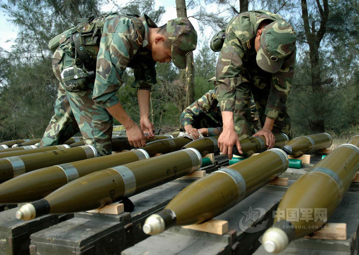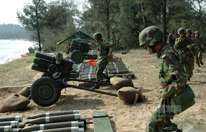军区某部根据部队担负作战任务的特点,把部队拉到东南沿海某海域,在紧贴实战条件下进行实兵实装实弹演练,检验部队年度训练成果,在恶劣复杂的条件下锤炼官兵们综合素质,提高部队突击力和精确火力打击能力,取得了首群覆盖,群群覆盖的优异成绩。图为炮兵分队正在进行火炮射击时的情景。