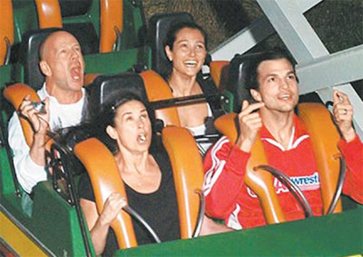 布鲁斯·威利斯(后排左)与前妻黛咪·摩尔(前排左起)、她的现任老公艾希顿·库奇乘云霄飞车玩得不亦乐乎。