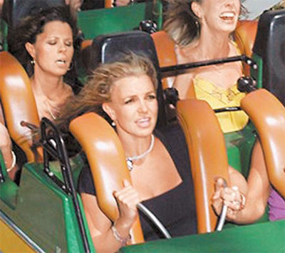 另外,最近瘦身有成的布兰妮(Britney Spears)也和友人一起去玩,藉尖叫释放压力。她近来“改邪归正”,不再出入夜店,衣衫也很整齐,跟拍她的记者拍不到她胡闹的照片,收入锐减,纷纷失业。在她的“脱轨全盛期”,每天至少有25人跟拍,现在只剩10人。
