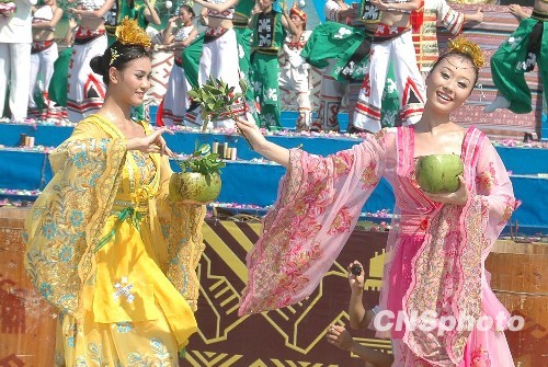 图为当地2009年七仙女形象小姐选拔赛选出的两位“仙女”向人们泼洒祝福之水。中新社发 尹海明 摄
