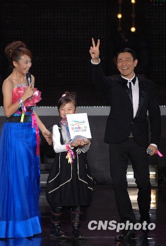 (中)在华仔“哀求”下终于把“叔叔”的称呼改成“华仔哥哥”,让华仔乐不可支。中新社发 李学仕 摄