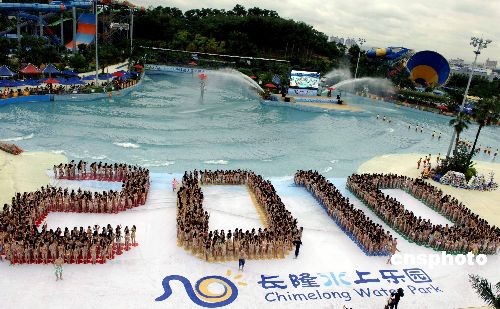 4月25日,身着比基尼的女士们为亲身参与打破吉尼斯世界纪录而欢呼。当日,为表达广州市民对2010年亚运会的期待,长隆水上乐园举办了有1290名女士参加的“2010”数字比基尼造型活动,挑战去年在这里创造的1202人的吉尼斯世界纪录。