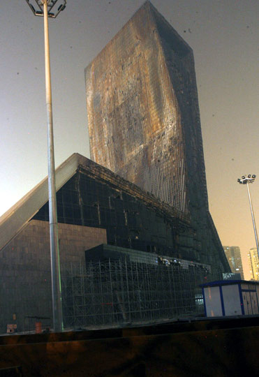 2009年10月26日,北京央视新址大楼配楼在过火大楼的南侧,已经搭起了数米高的脚手架,现场工作人员表示,该楼将重新进行外墙装修。中新社发 玉龙 摄