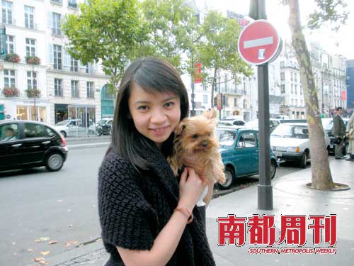 在巴黎一家咖啡厅外,杨雅晴抱着自己的宠物狗。她说:“我(索吻)的动机很单纯,我就是想知道跟100个男人亲吻是什么感觉。” 摄影春玉